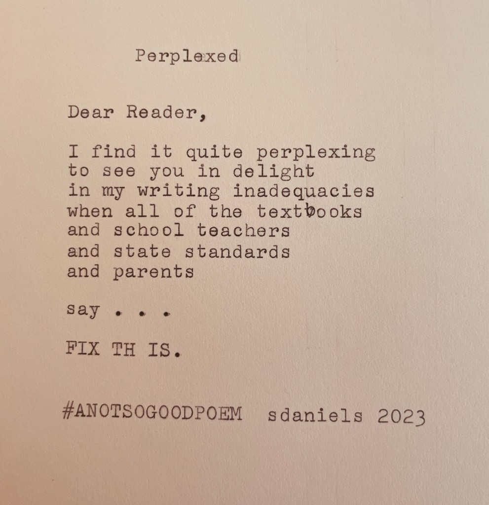 Perhaps I was not cut out for the Slice of Life Challenge this year. On Day 1, I wrote a poem and on Day 30, a response poem to the responses to the poem. It is quite perplexing.